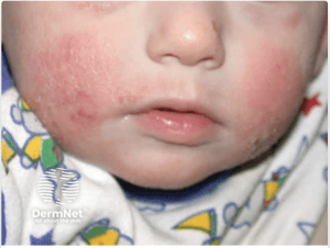 Viêm da cơ địa ở trẻ nhũ nhi tại vùng má (infantile atopic dermatitis on the cheeks).